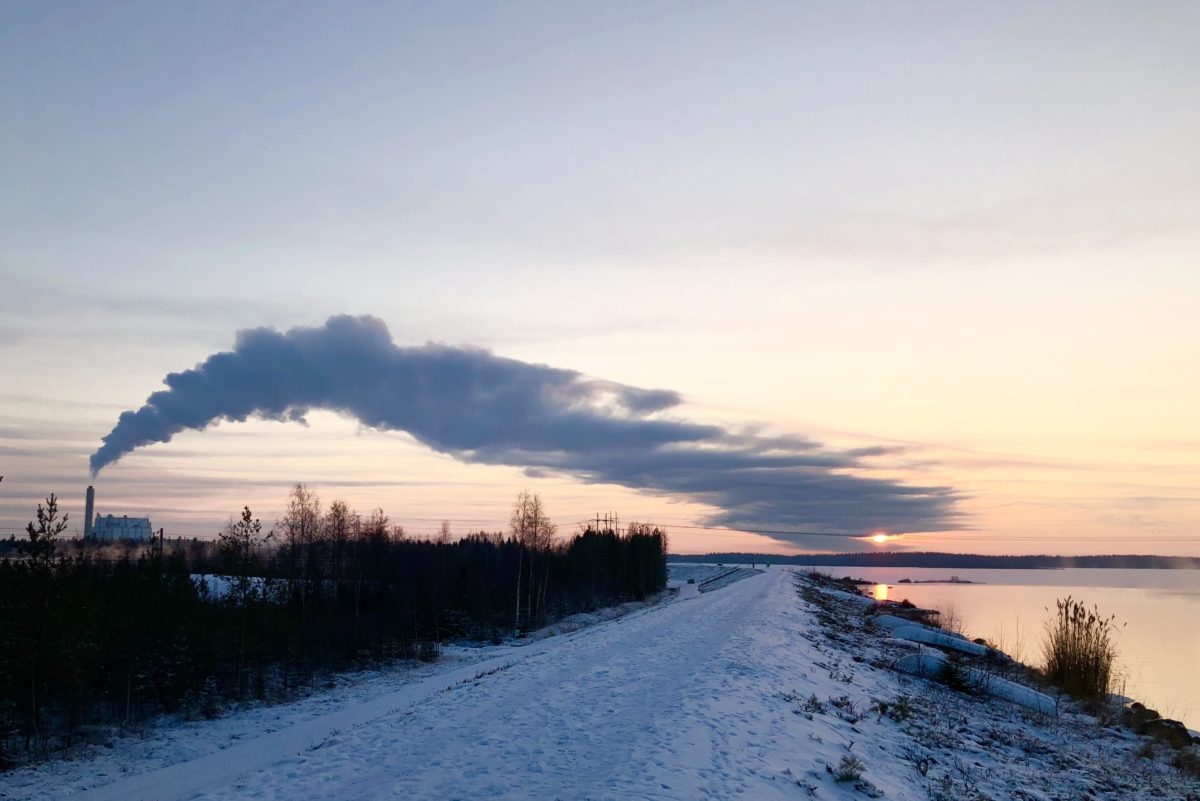 Lähdimme aatonaattona kävelylle auringonlaskua ihailemaan. Voimalaitoksen savupilvi kuitenkin peitti upeat talviset näkymät. Kuvassa näkyy paljon ihmisen ristiriitaisia jälkiä; Kyrkösjärvi on tekojärvi, joka on tehty patoamalla, ja toimii tulvasäännöstelyaltaana luonnostaan tulva-alttiilla seudulla. Järven valli on suosittu lenkkeilyreitti. Oikealla näkyvä sula on voimalaitoksen lauhdeveden laskupaikka, joka pysyy avoimena läpi talven tarjoten linnuille ruokailupaikan. Nytkin siellä ui joutsen.