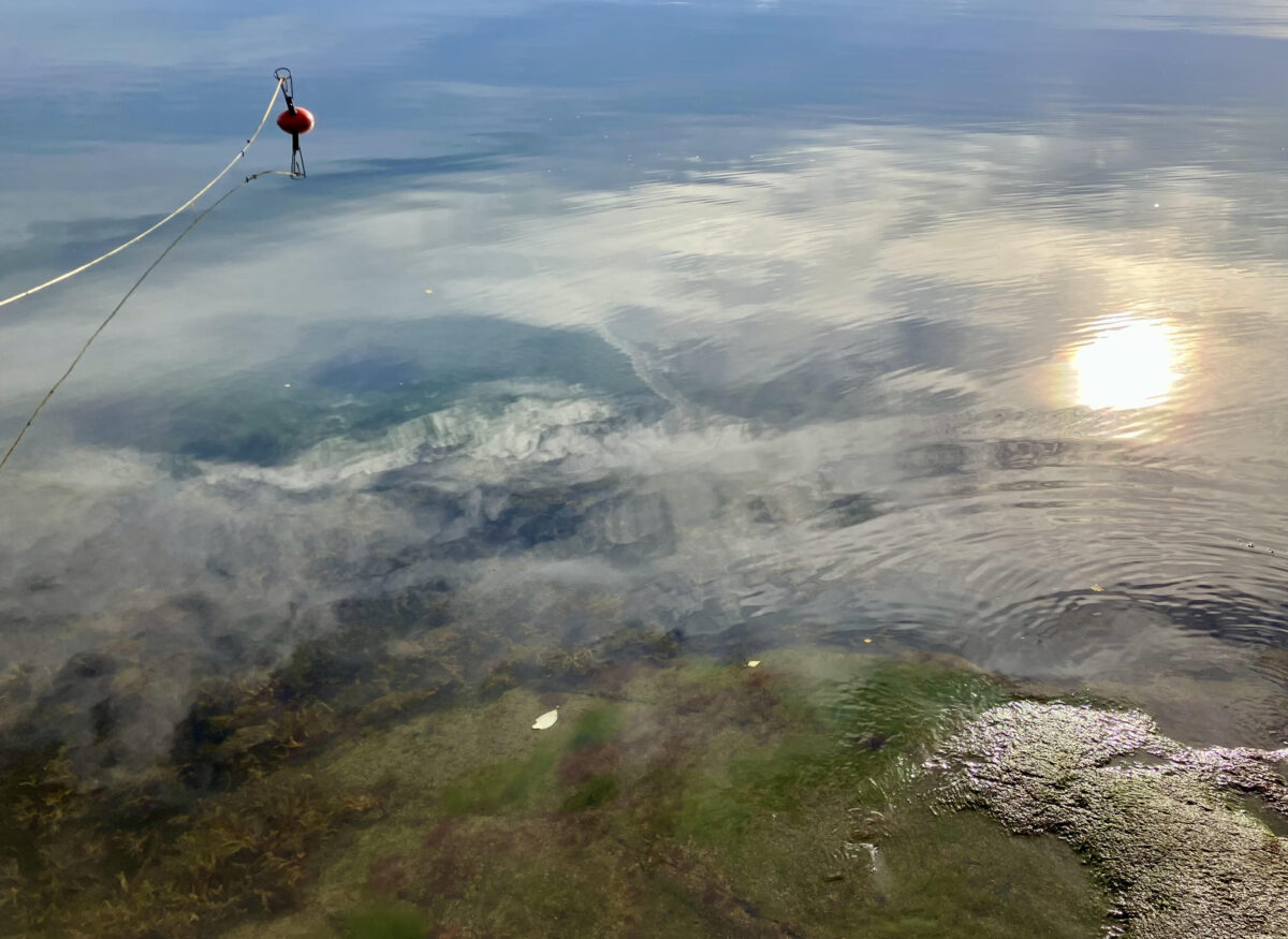 Kuva on otettu Korppoossa syyskuisena aamuna, hetkenä jolloin meri oli niin tyyni, vesi ja aurinko kirkkaat ja pilvet keveitä, että vedenpinnan molemmat puolet tulivat näkyviksi rantaveteen katsottaessa.
