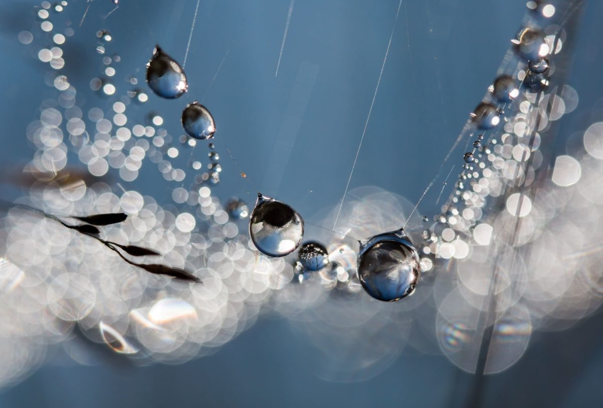 Kastepisaroita hämähäkin vahvassa seitissä.