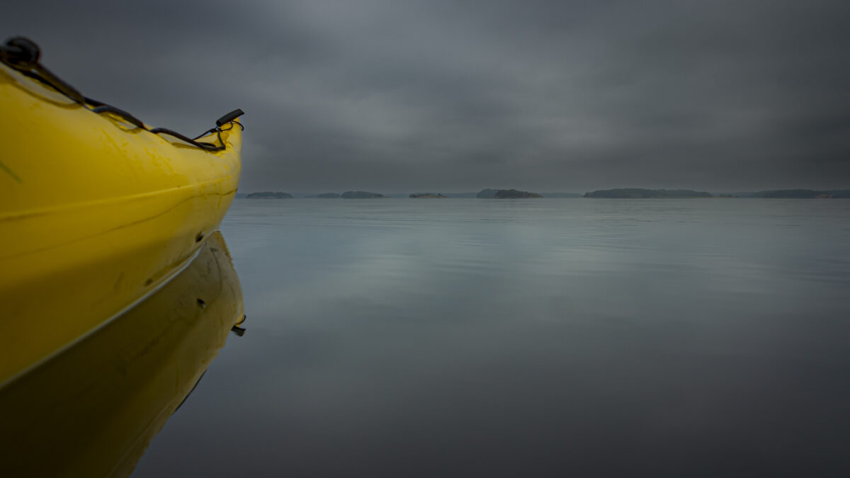 Lähdin melomaan aamulla aivan tyynellä merellä, ilmassa oli hieman sumupilveä ja usvaa. Aivan kuin olisi toisessa maailmassa. Kuva on otettu Rymättylän länsipuolen saaristossa.