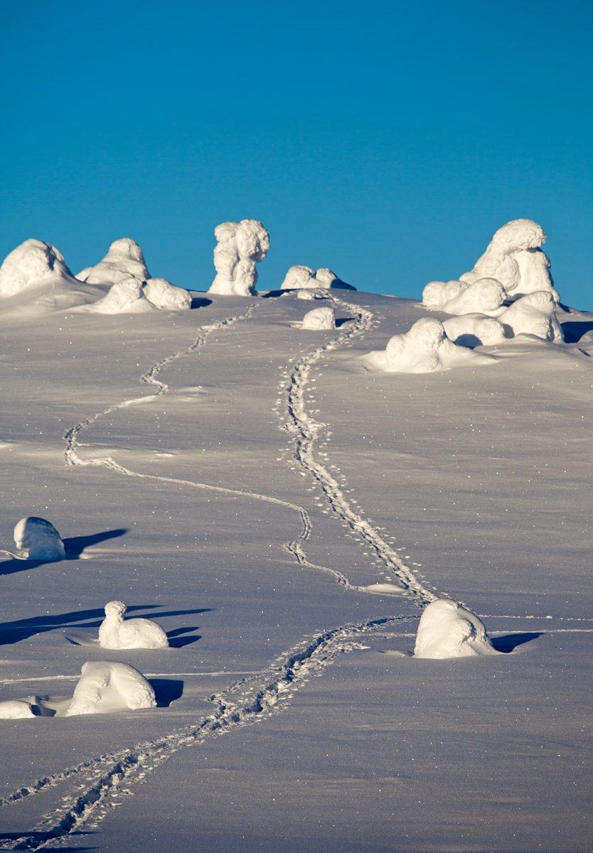 Riisitunturi Posiolla on suosittu retkikohde sekä kesällä että talvella. Tykkypuiden lomassa lumessa kiemurtelevat polut.
