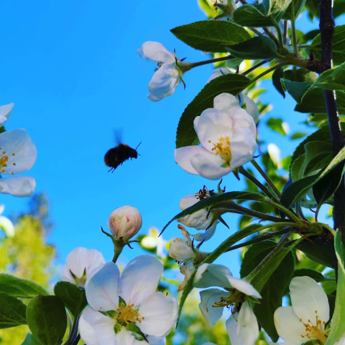 Häärättiin molemmat omenapuun kukkien kimpussa. Pääsin testaamaan kuvaamista uudella kännylläni.