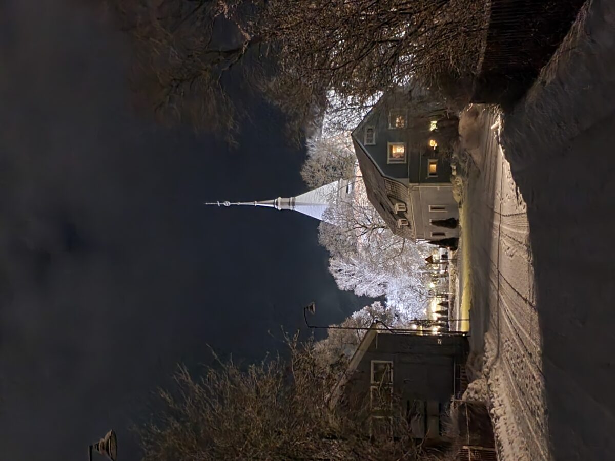 Juuri satanut lumi ja valaistus tekivät kirkosta valkoisen
