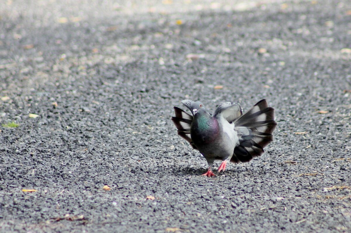 Kesykyyhky pyrähti noukkimaan kiviä kivipiiraaseen ja hieman kompasteli alamäessä, ja leväytti pyrstösulkansa hienoksi viuhkaksi.