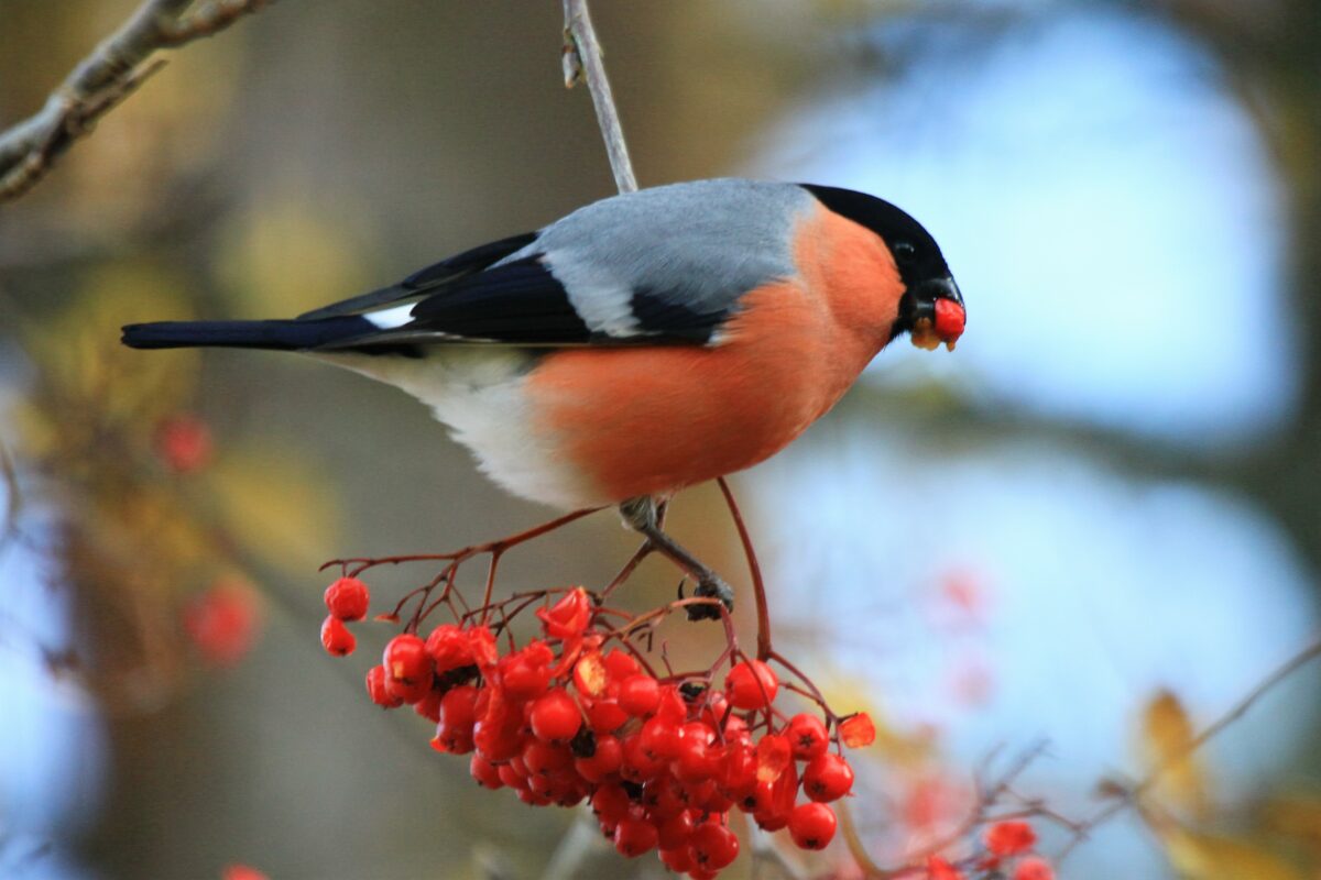 Syksyn tullen Punatulkut syövät pihlajanmarjoja mielellään