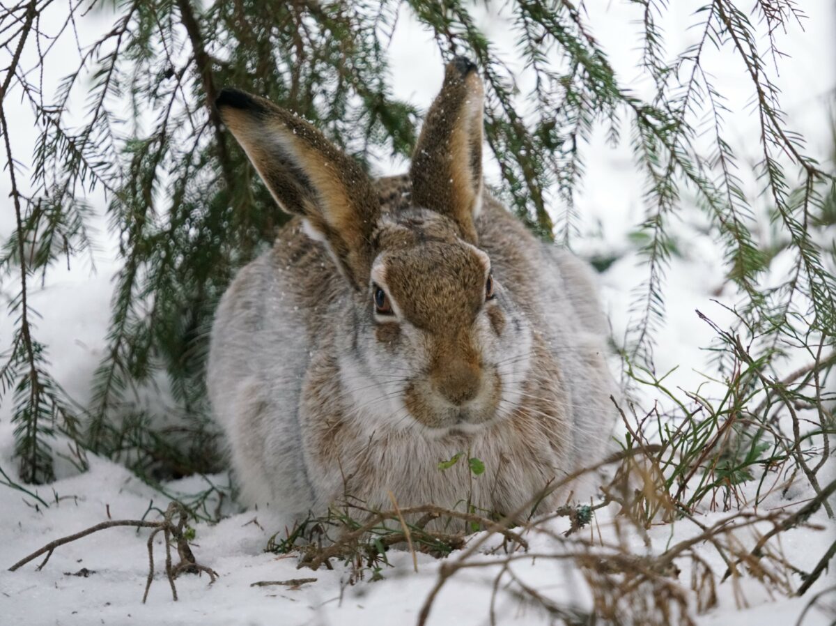 Vietettiin loppiaista mökkimaisemissa. Hiljaista oli luonnossakin, mutta löytyi muutamia tuoreita jälkiä lumelta. Jäniksen jäljet löytyi aivan mökkimme läheisyydestä ja hetken tarkastelun jälkeen havahduin möykkyyn kuusen juurella. Iso rusakko luotti täysin suojaväriinsä ja pääsin ottamaan muutamia kuvia jänöstä, jonka jätin sitten jatkamaan päikkäreitään.