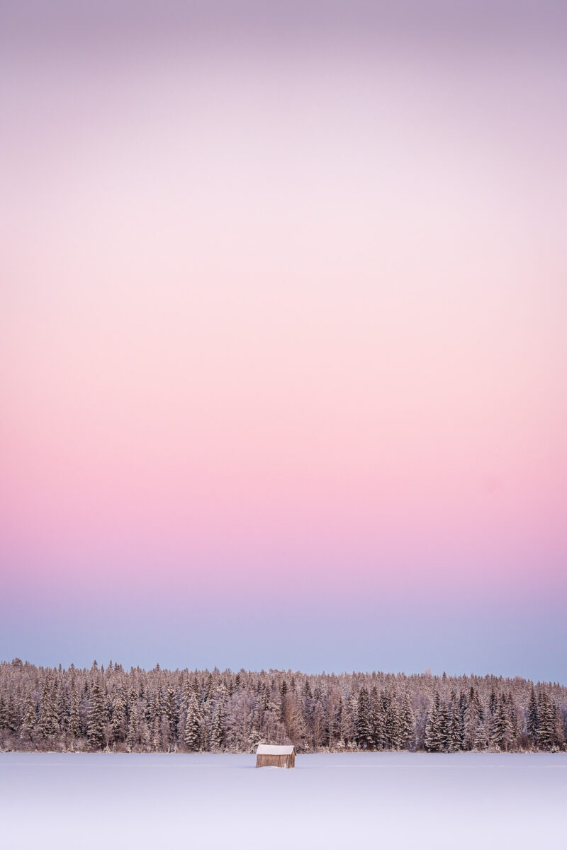 Mittari on laskenut jälleen reippaasti pakkasen puolelle, värjäten taivaanrannan purppuran eri sävyihin laakean pellon takana. Lato keskellä maisemaa luo kauniin yksityiskohdan minimalistiseen kuvaan.