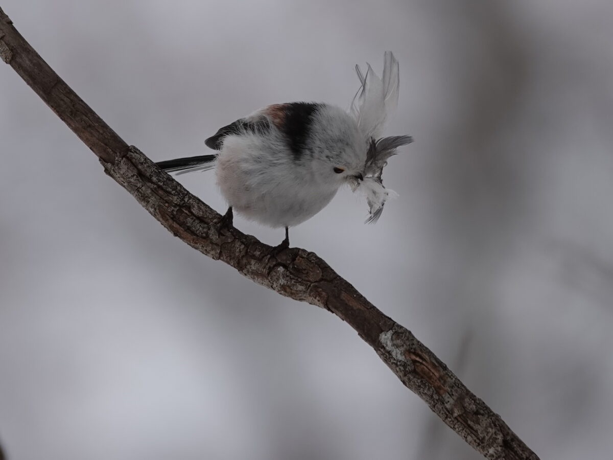 Suloinen pyrstötiainen pyrähti ruokintapisteen oksalle huhtikuisena päivänä iltapäivän valossa