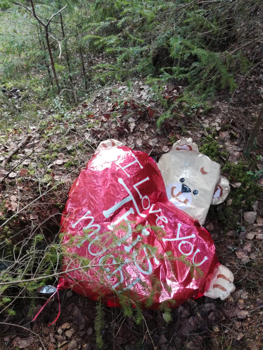 Tähän kirkkaaseen \"olioon\"törmäsin tuossa joku aika sitten.Ihmettelin kaukaa ensin, mutta lähemmin tarkasteltuna,aika hauskan näköinen veijari.Mutta ei tietenkään metsään, luontoon kuuluva. Onkohan joku lapsi menettänyt tämän vaikka viime vappuna?