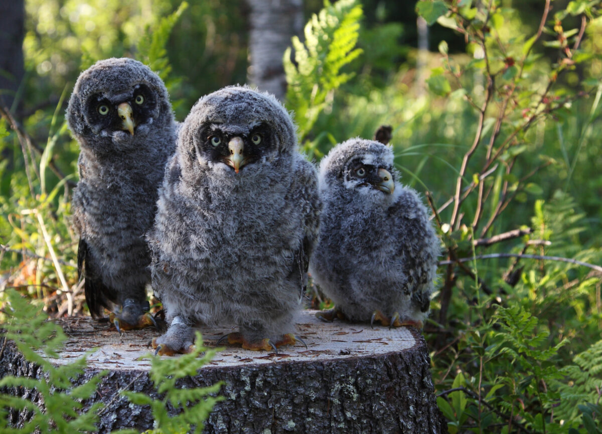 Olin rengastajan matkassa lapinpöllön pesällä ja löysimmä nämä poikaset jo pesästään lähteneenä lähimaastosta. Rengastuksen jälkeen laitoimme pojat kannolle, jossa ne poseerasivat nätisti kuvaajalle. Kuva otettu Torniossa kesäkuussa 2010.