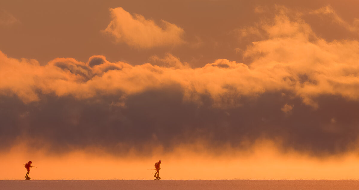 Meri on saamassa jääpeitteen, ja vain sataman laivaväylä pysyy enää avoimena. Ohut jääkerros kantaa retkiluistelijat, kun väylästä kohoava merisavu ja taivaalla liikkuvat pilvet luovat pakkasaamun dramaattisen maiseman.