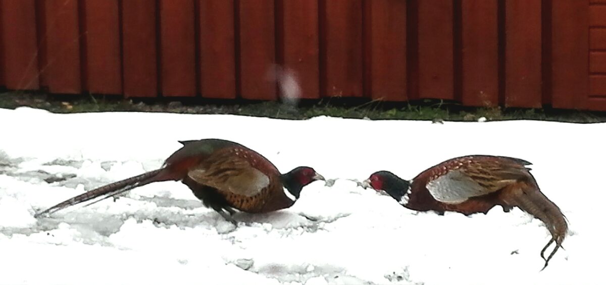 Nopeasti ikkunan läpi otettu kuva kahden fasaanikoiraan reviiritaistelusta. Lintujen asennot tuo mieleen ikonisen Taistelevat metsot- maalauksen.