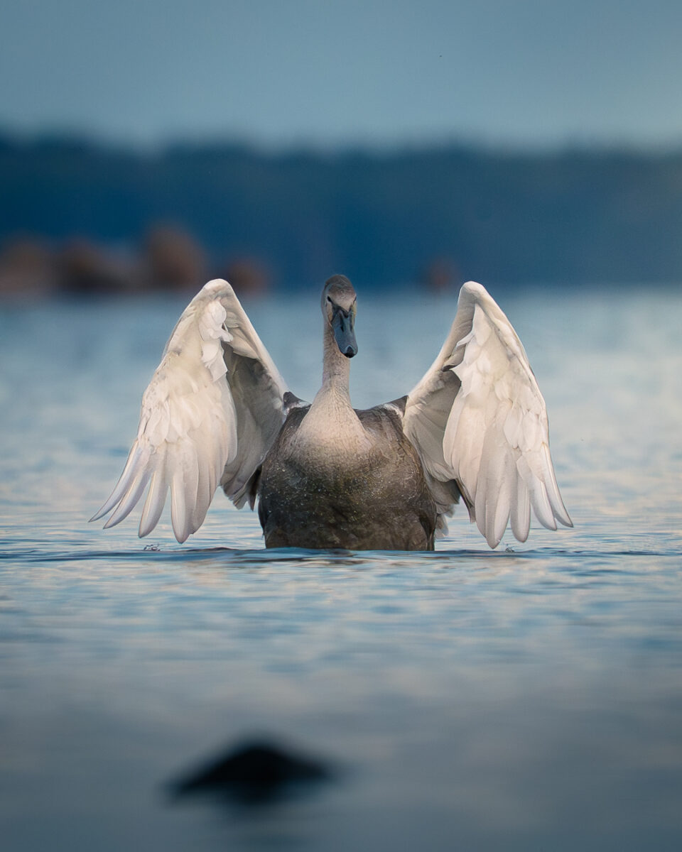 Kyhmyjoutsenen jo lähes aikuinen poikanen verryttelee siipiään Kotkan Äijänniemen edustalla.