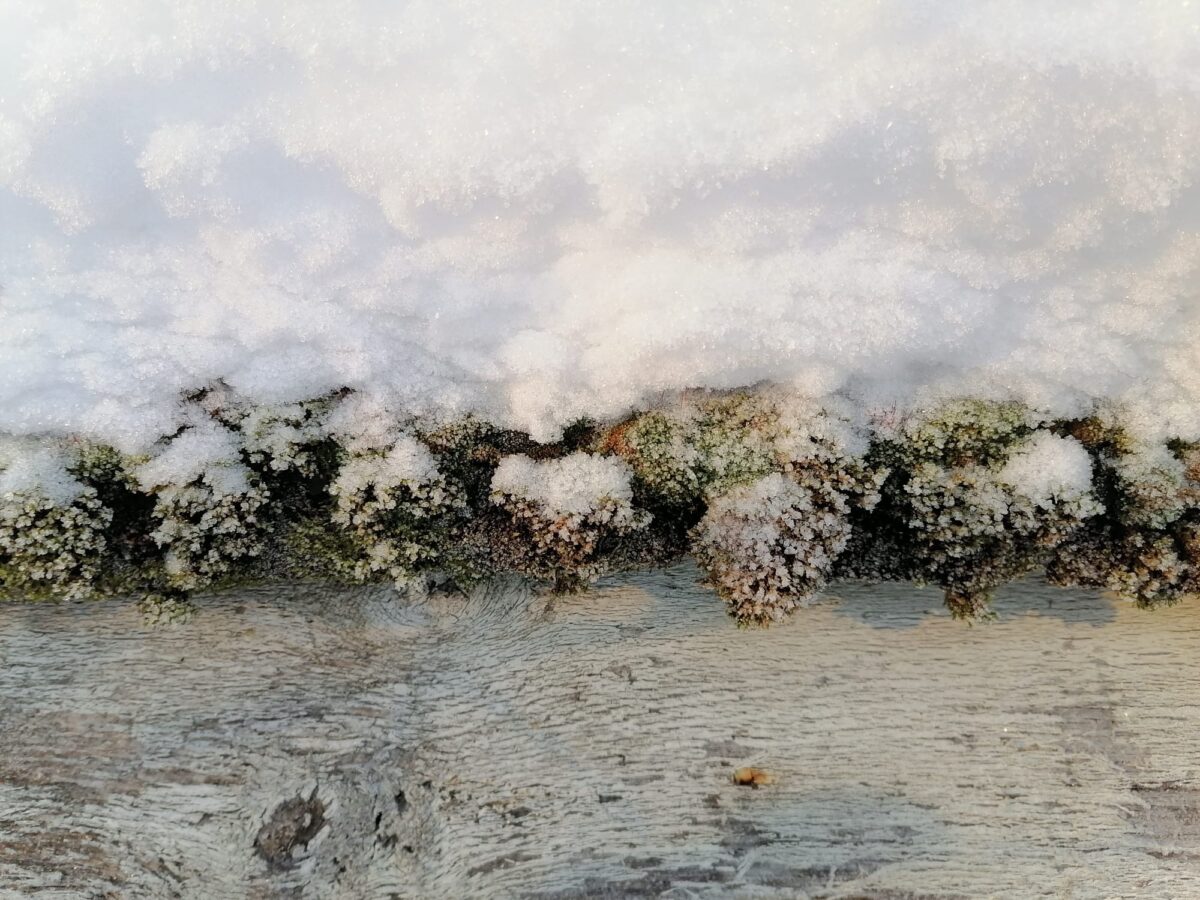 Vanhan rakennuksen katolle on vuosien saatossa kasvanut sammalta, lumen alta sitä näkyy vain aivan räystään reunalta.