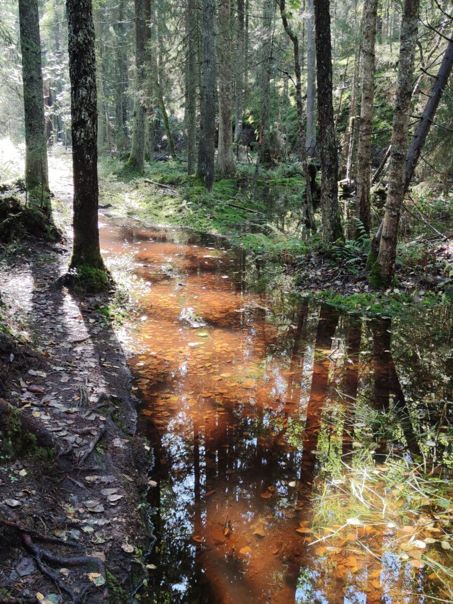 Syyskuisten sadepäivien jälkeen aurinko tuli taas esiin ja sai tulvivan syvännepolun hehkumaan. Kuva on otettu Timmermalmin luonnonsuojelualueella Vantaalla.