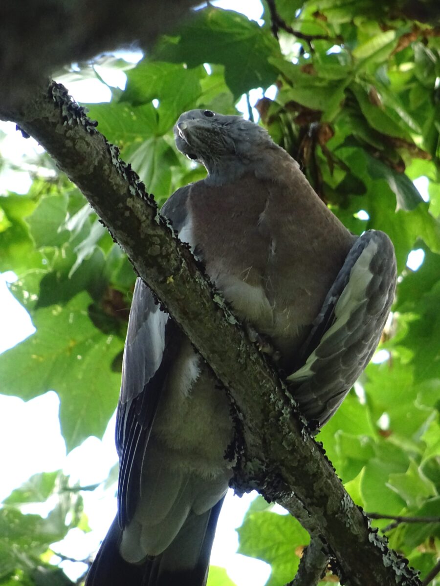 Utelias kesällä syntyneen sepelkyyhkyn poikanen vaahteran oksalla. Kuvassa olevan sepelkyyhkyn ja tämän sisaruksen kasvua tuli seurattua pari vuotta sitten, kun eräs sepelkyyhkypari päätti tehdä pesänsä meidän puutarhan omenapuuhun.