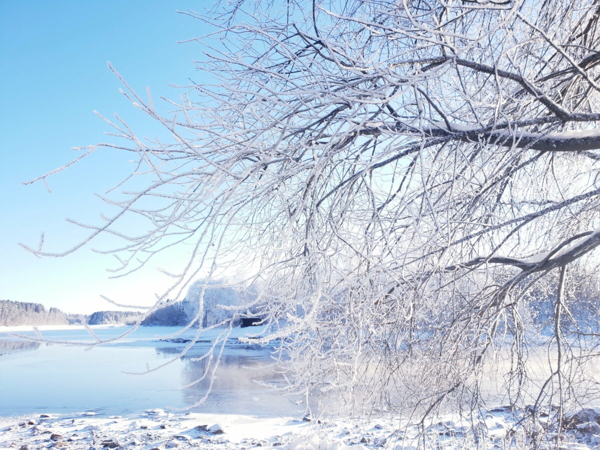 Suomalainen talvi Satakunnassa on minun talveni. Luminen puu, sininen taivas ja avoin Kokemäenjoki. Niin kaunista!