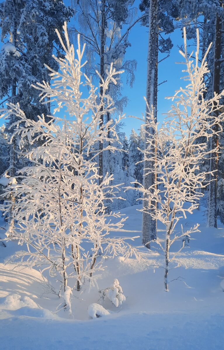 Iltapäivällä puoli kahden aikaan satuin täydelliseen aikaan paikalle, kun vuoden ensimmäisen päivän aurinko valaisi kauniisti hentojen koivujen lumihuurteiset oksistot.