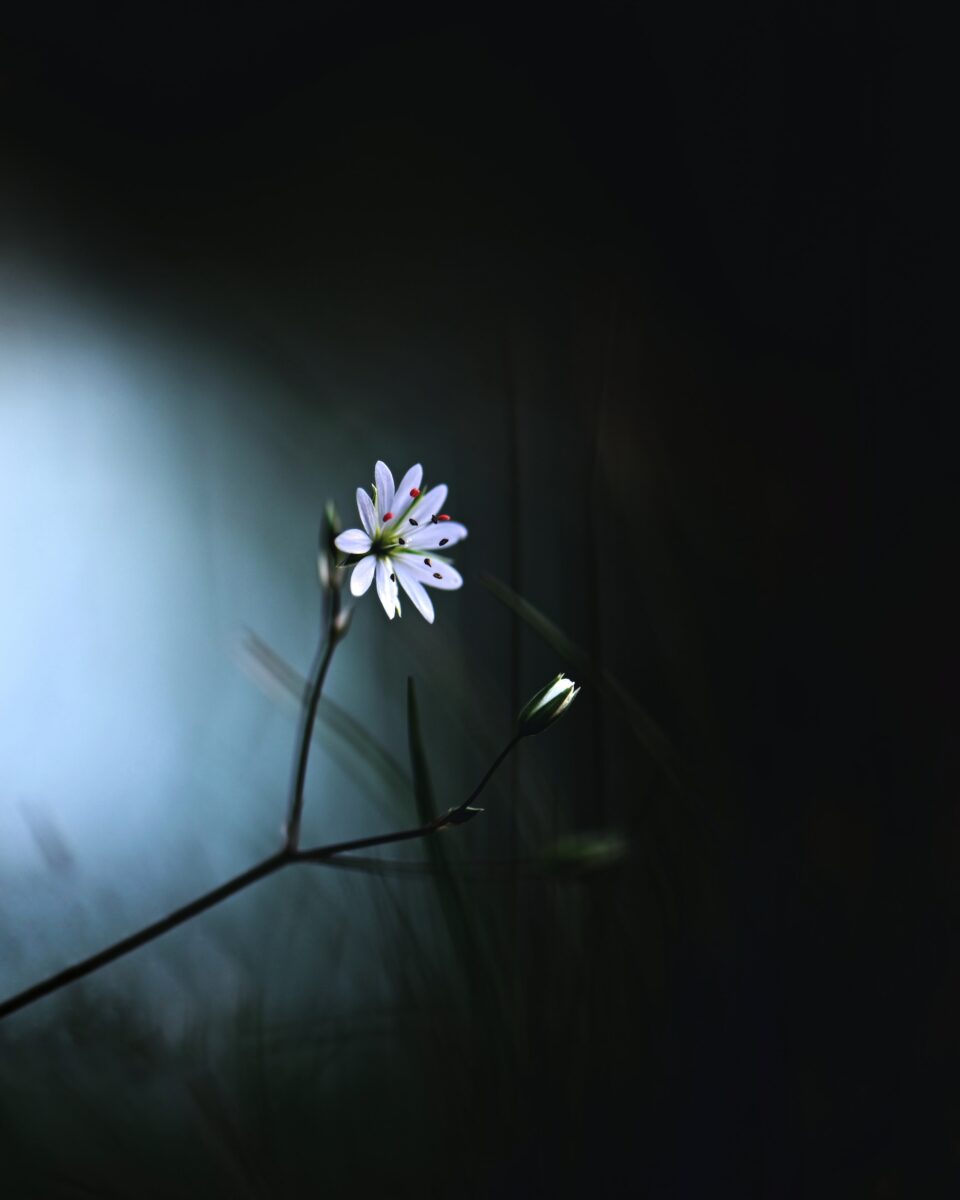 Pieni tähtimö kesäkuisen hitaasti hiipuvan valon ja varjon suojissa. Kuvattu Houtskarissa, Turun saaristossa kesällä 2021.