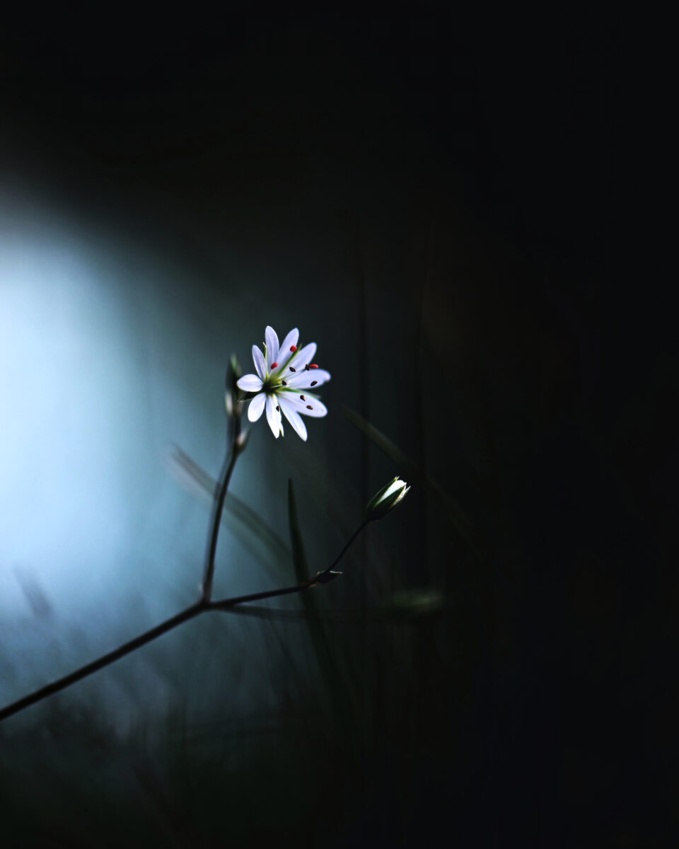 Pieni tähtimö kesäkuisen hitaasti hiipuvan valon ja varjon suojissa. Kuvattu Houtskarissa, Turun saaristossa kesällä 2021.