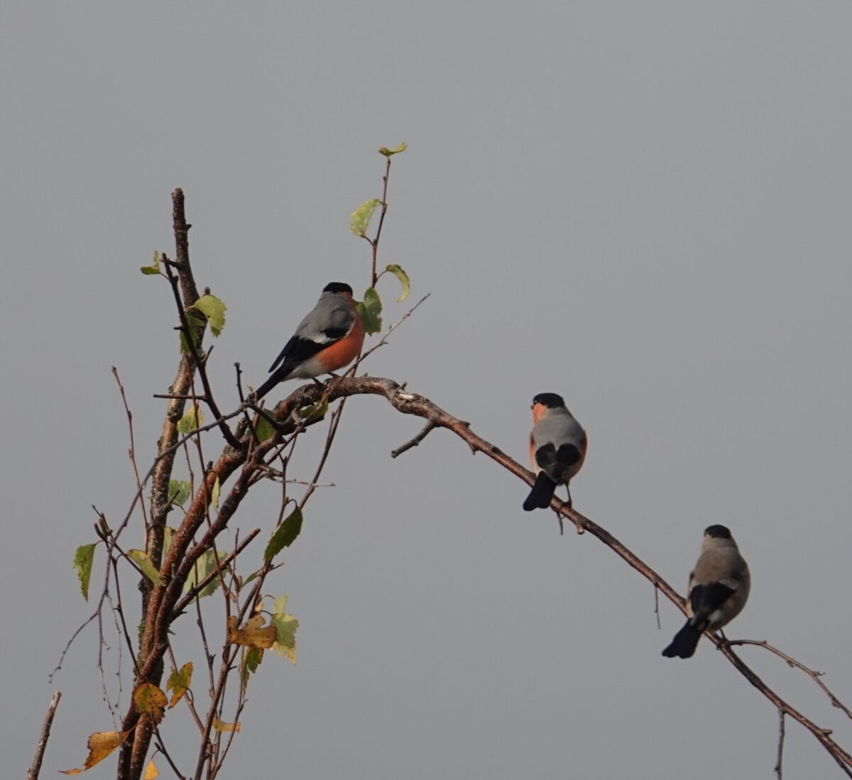 Punatulkut pysähtyivät hetkeksi puun oksalle, Ylivieskan korkeimman mäen päällä. Huomaa keskimmäisen linnun sydämellinen yläperä.