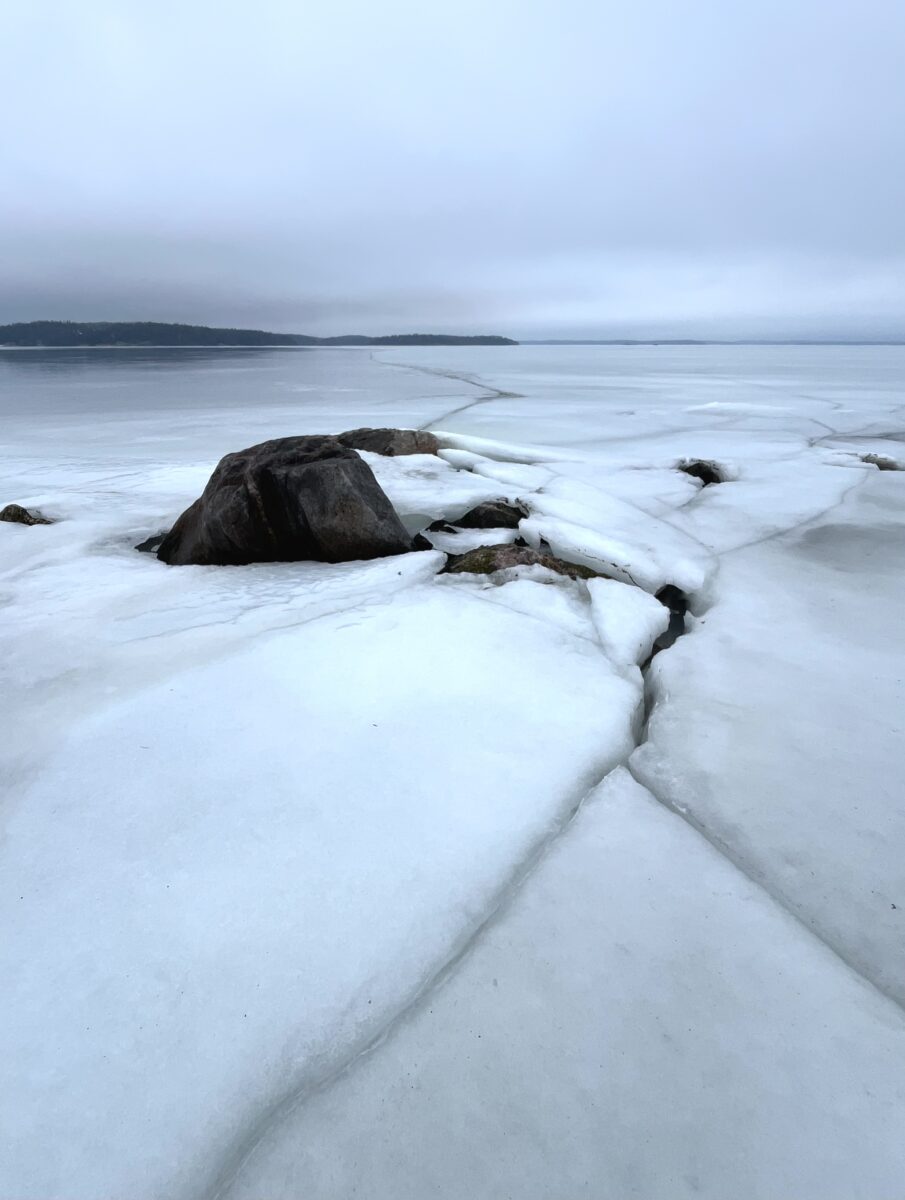 Retkiluistelemassa Rymättylässä helmikuussa 2024. Sumuinen sää hävitti värit. Jäällä pienikin jäästä poikkeava muoto erottuu ja kiinnostaa.