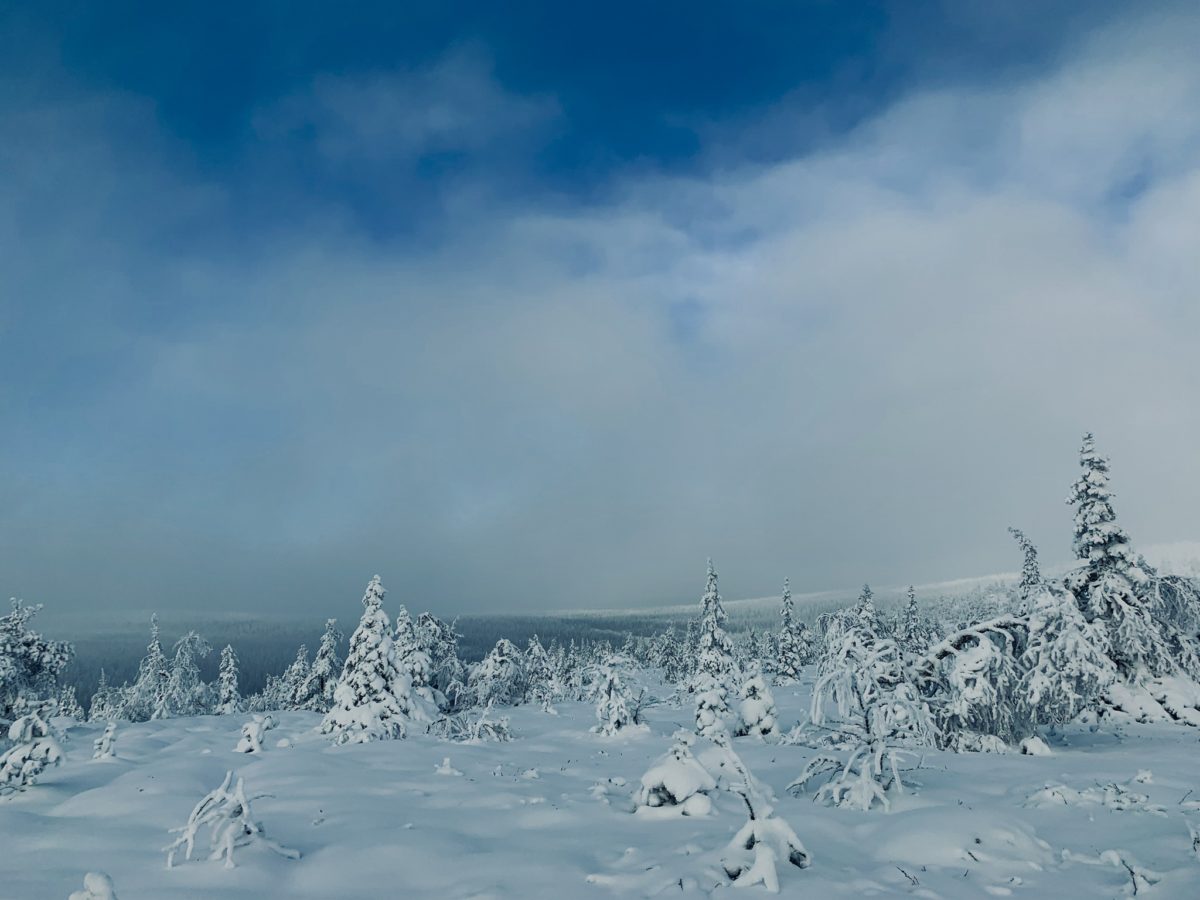 Nousimme Riisitunturille sumussa. Lähdimme laskeutumaan tunturin toista puolta jolloin aurinko näyttäytyi. Olimme kuin satumaisemissa.