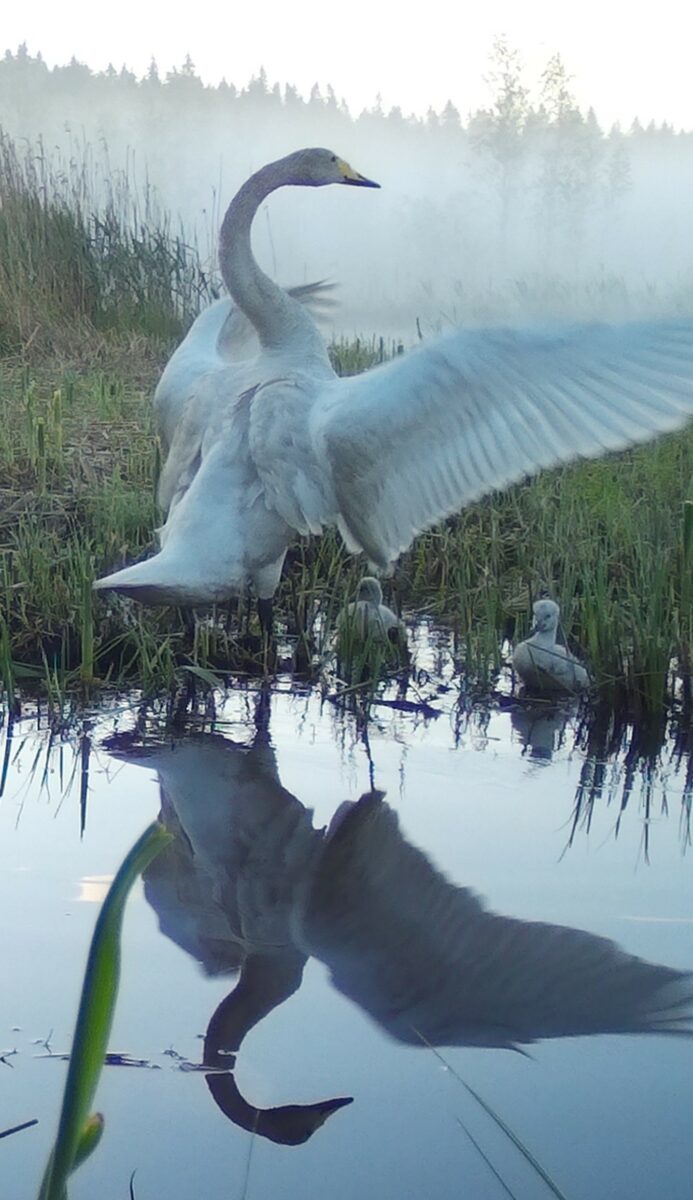 Herkkäkuva Joutsenemosta joka suojelee poikasiaan