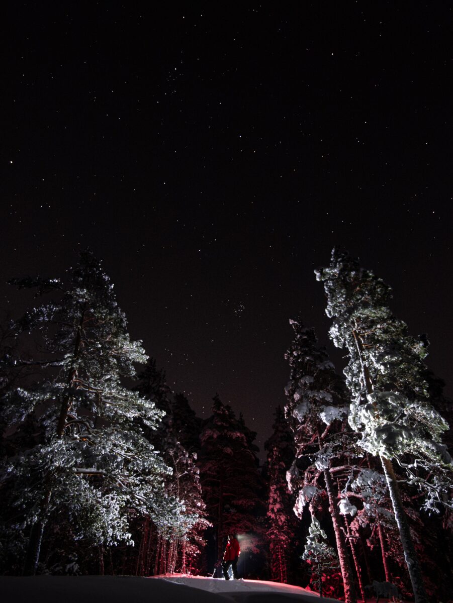 Olin retkeilemässä ystävieni kanssa Nuuksiossa joululomalla. Kuvassa näkyy tähtitaivas sekä taskulampulla valaistu puut ja retkeilijä.