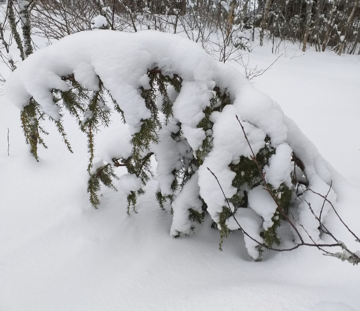 Kuva kotini \'puolen hehtaarin metsästä \' jossa kasvaa ilahduttavan paljon katajaa.