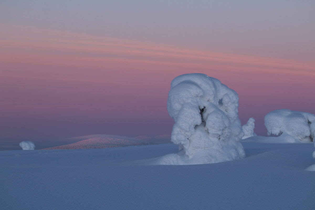 Kuva otettu Kukastunturilta kohti Pallastunturia tämän vuoden ensimmäisenä päivänä, taivaalla hienot kaamoksen sävyt kuin pensselillä maalaten.