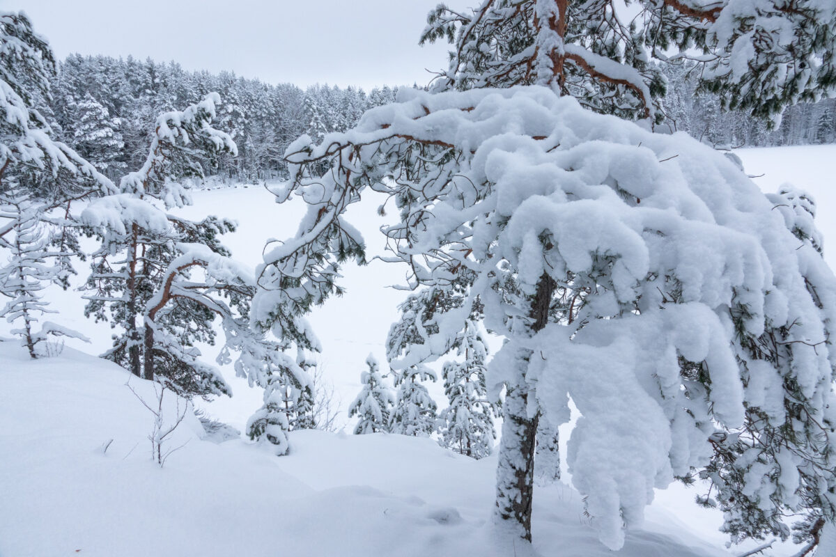 Lumen kuorruttamia puita talven sinisessä hämärässä Luopioisten Vohlisaaressa 27.12.23