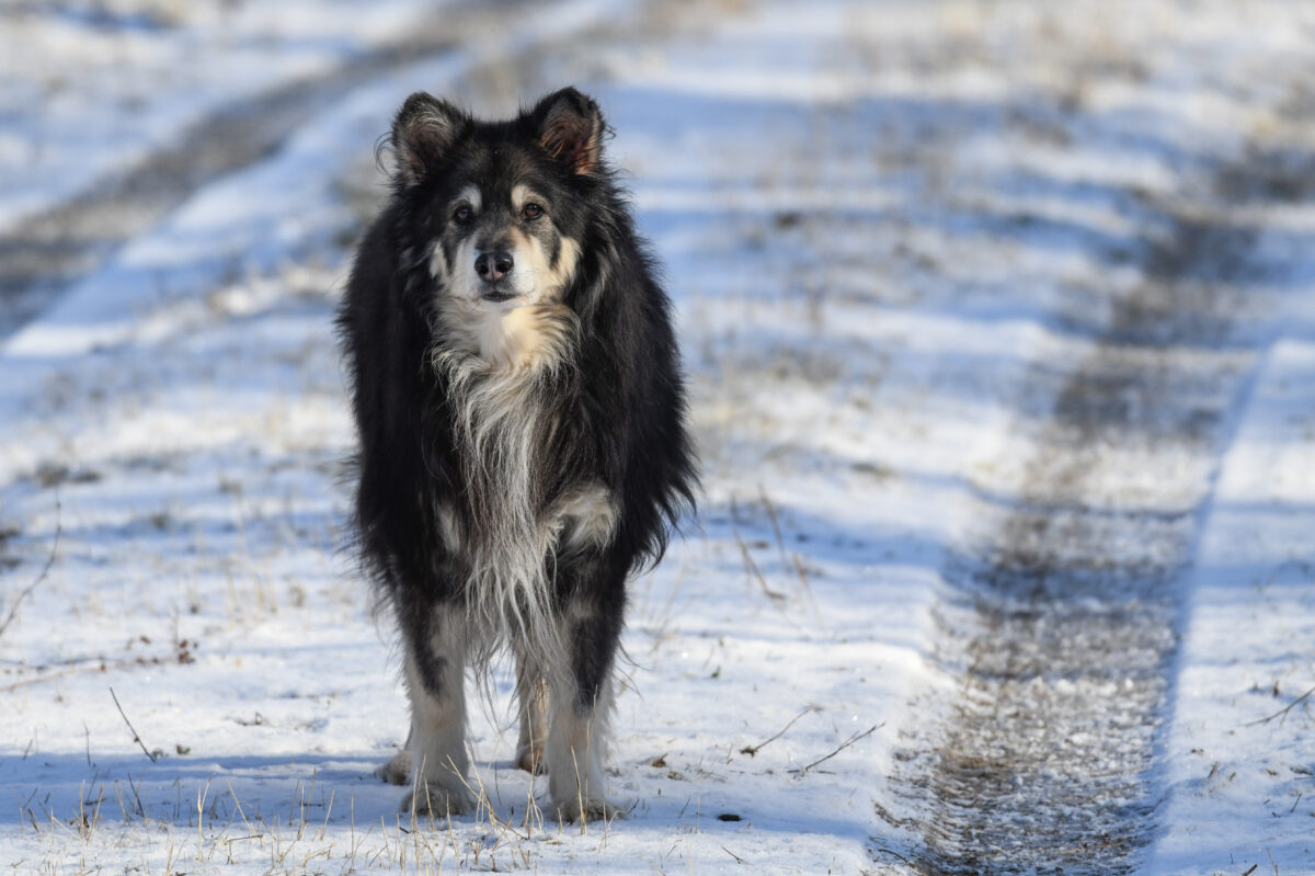 Ikääntynyt paimensukuinen lapinkoira mökkitiellä omissa ajatuksissaan.