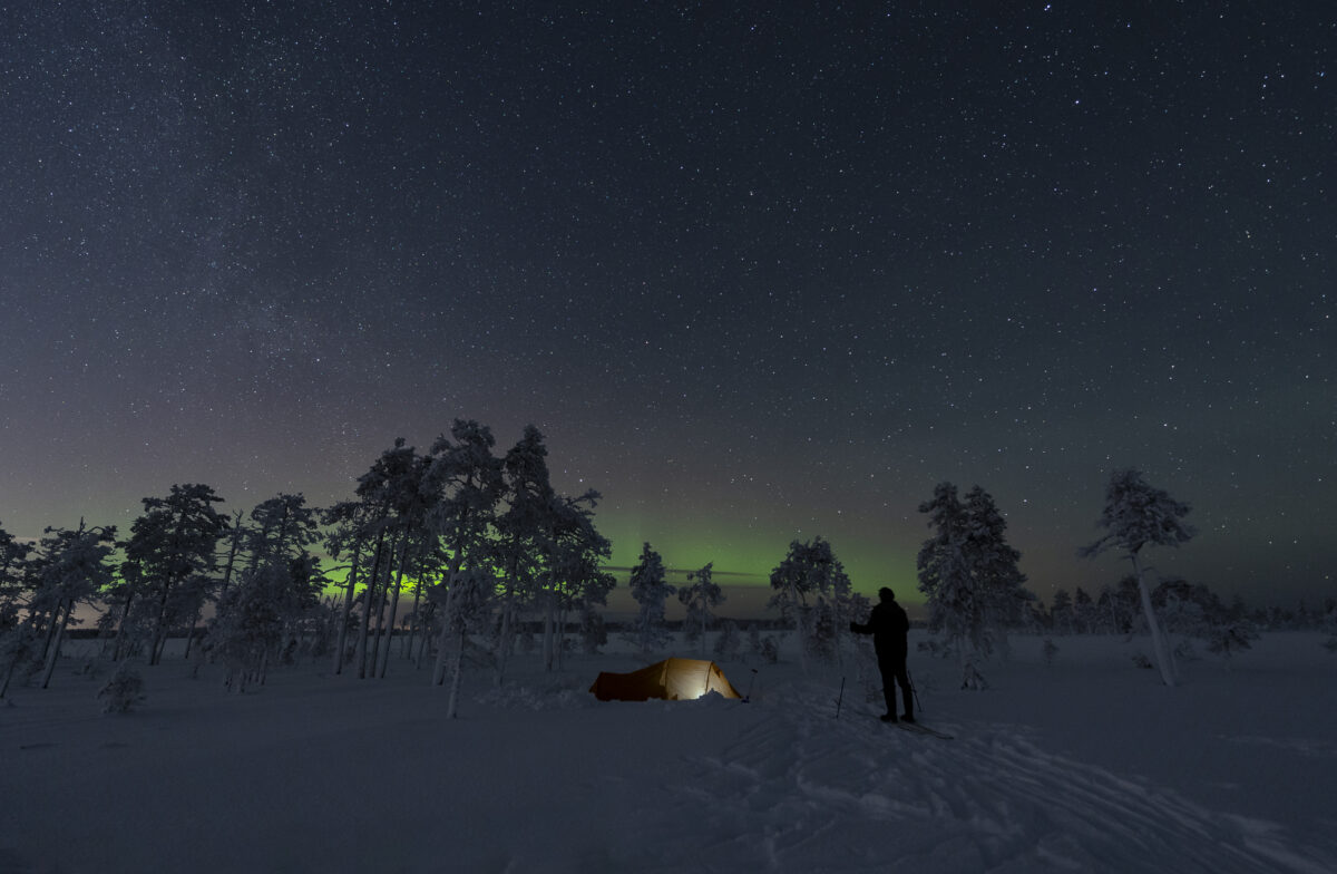 Kulunut talvi on tarjonnut mahtavat olosuhteet talviretkeilyyn ympäri Suomen. Kovat pakkaset ja hieno lumipeite ovat luoneet upeat olosuhteet. Kuvan yönä oli pakkasta -34C astetta mutta hyvällä varustuksella yö oli upea. Hiihtelimme koiran kanssa laajalle suoalueelle Pohjois-Pohjanmaalla ja nautimme luonnonrauhasta. Ympäröivän luonnon hiljaisuus oli mykistävä. Aamulla korppipari lenteli suoaukean yllä ja tulomatkalla teeriparvi ruokaili suon reunakoivikossa.