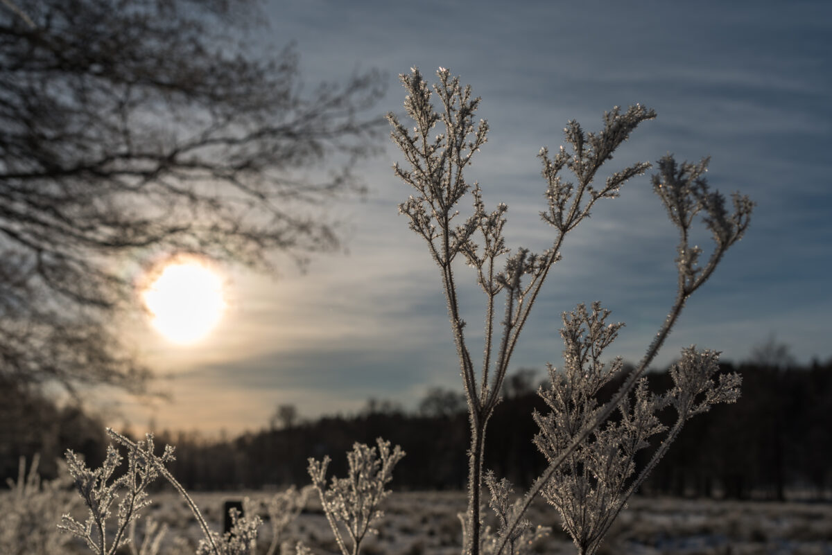 Talvinen kävelyretki Fiskarssissa 2017. Aurinko paistoi vielä matalalta ja kirpakka pakkanen oli koristellut talventörröttäjät jäätimantein.