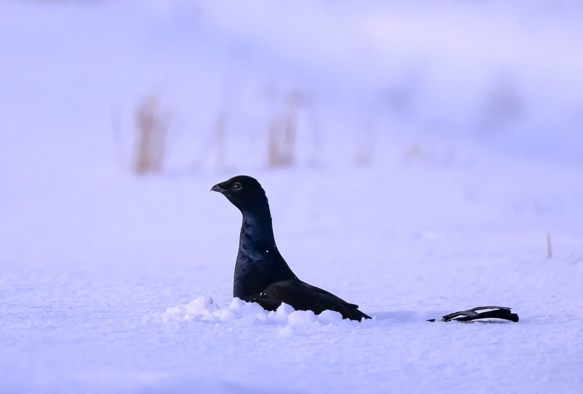 Teeri laskeutui pehmeälle lumelle. Kuvattu 17.12.2023 Viitasaarella.