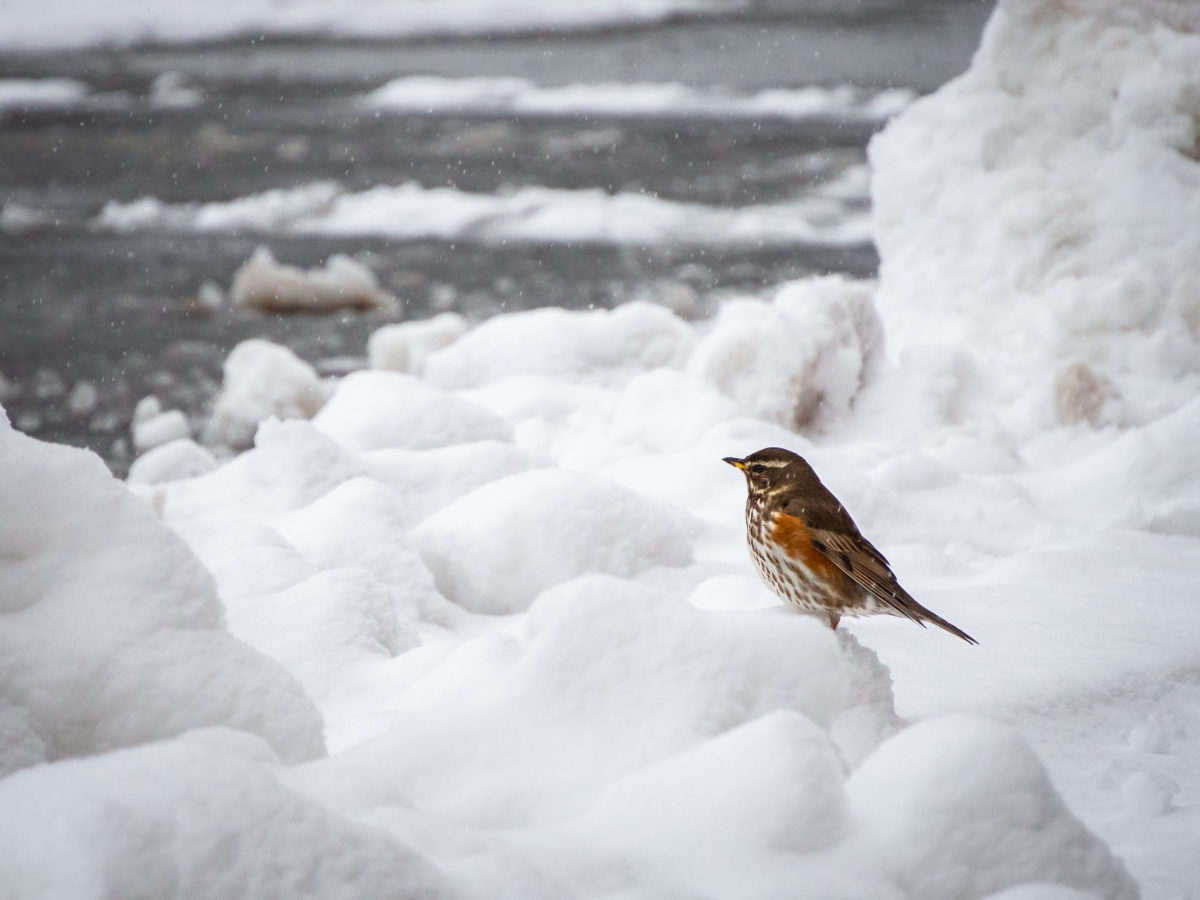 Kuva on otettu Oulussa 3.5.2019, kun takatalvi yllätti runsaalla lumentulollaan ihmisten lisäksi myös kuvassa olevan punakylkirastaan.