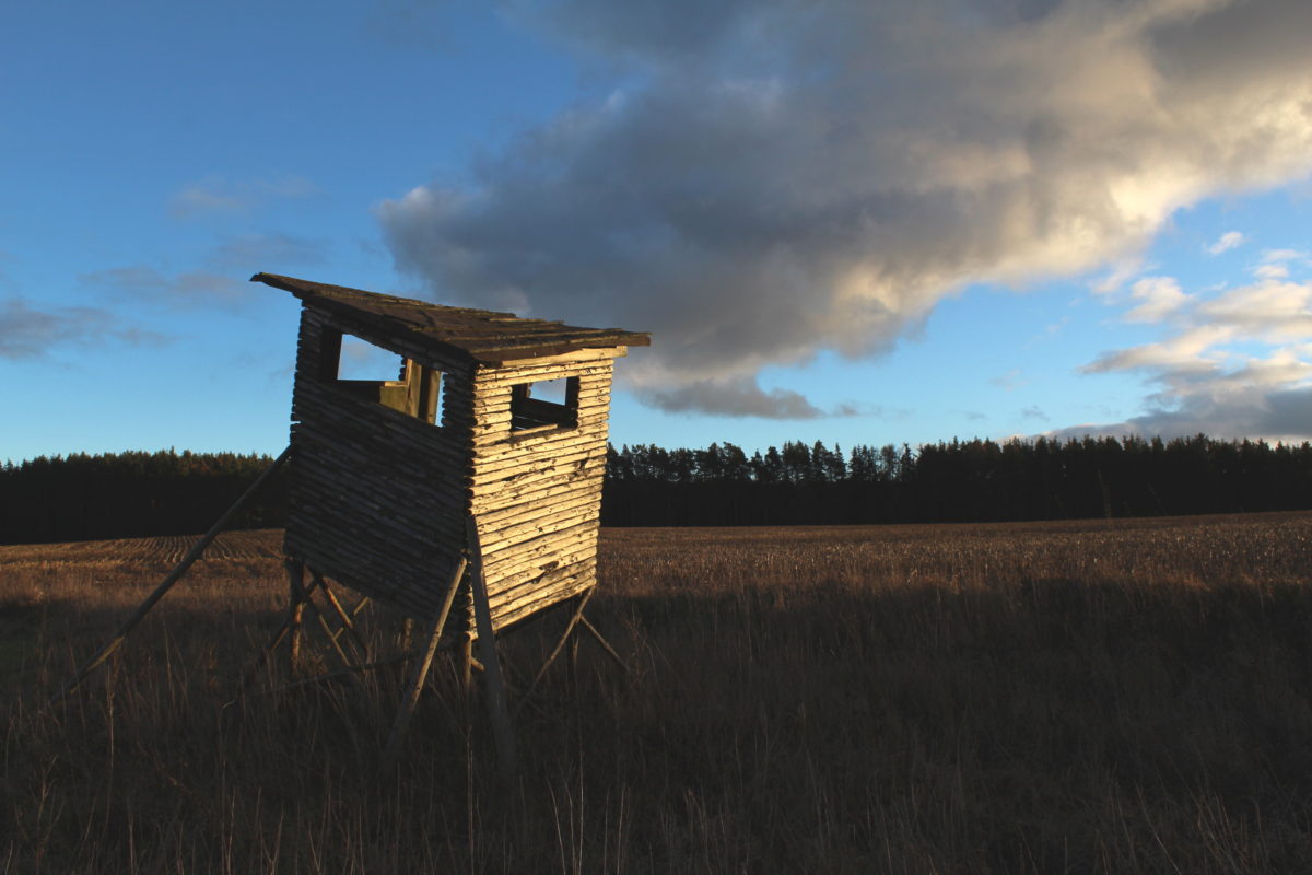 Hylätty metsästäjäkoppi suon reunalla.
