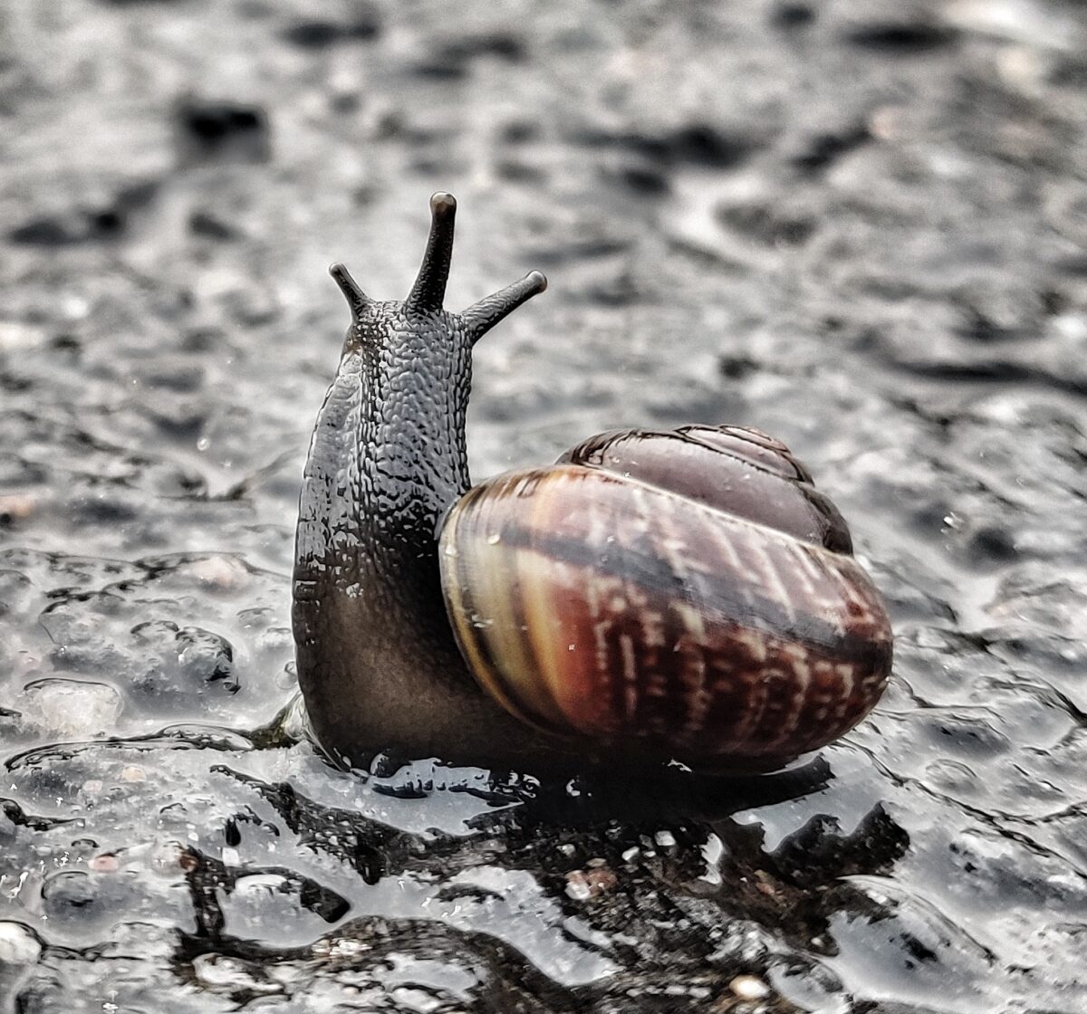 Pyörätiellä, jonka etanat (kotilot) aamuisin ylittävät, oli vaarallista. Pyöräilijät eivät aina osanneet väistää näitä, joten niitä oli murskaantuneena joka aamu useita. Tämä yksilö oli valppaana.