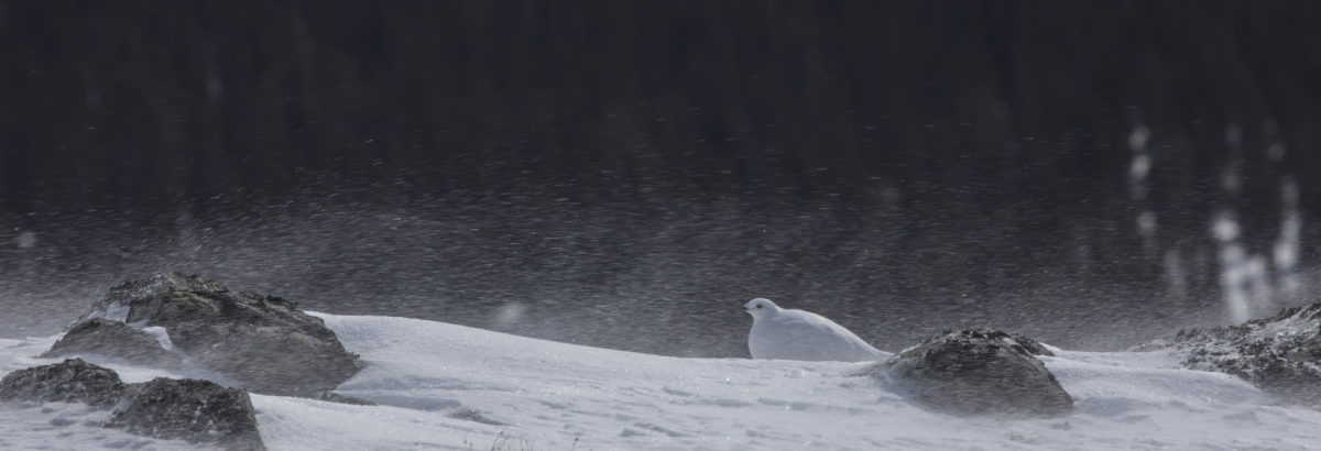 Kiiruna ruokaili Pallastuntureilla tuiskuisena päivänä.
