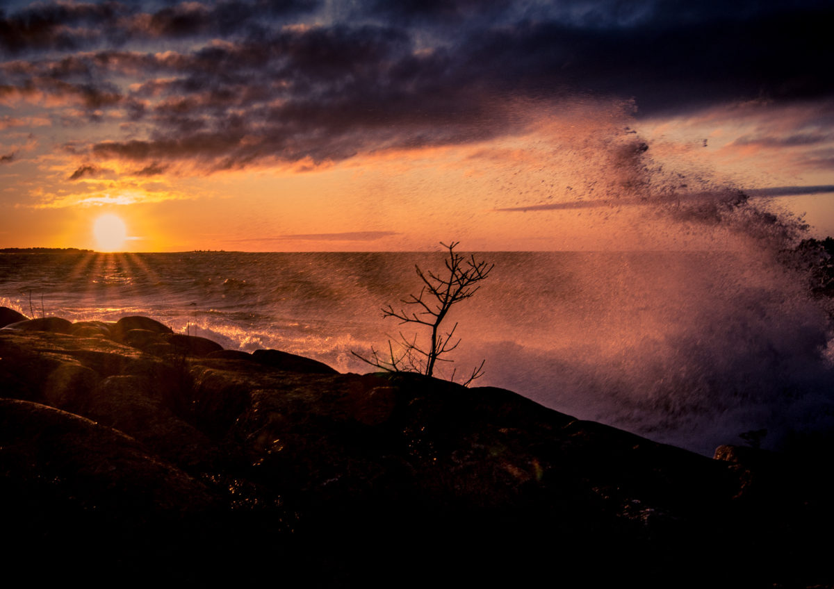 Pieni puu on juurtunut aivan meren rannalle kallioille suolavesi pärskyjen jatkuvasti huuhtomaksi.