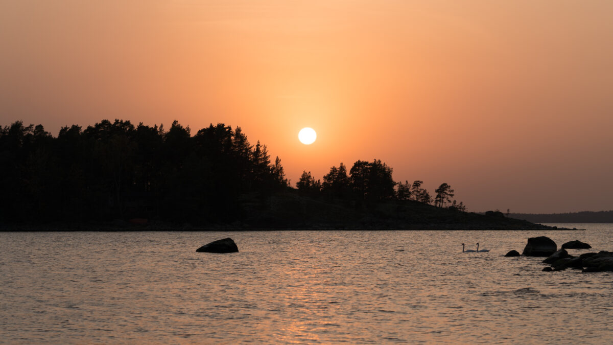 Joutsenet uintiretkellä auringonlaskun aikaan Kotkan Santalahdessa 2.8.2020.