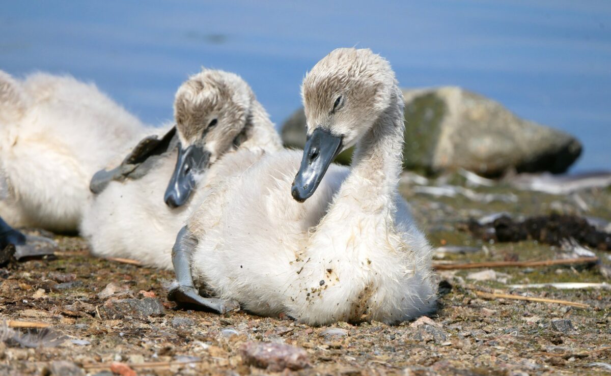 Töölönlahdella unisia joutsenenpoikasia kesäauringossa.