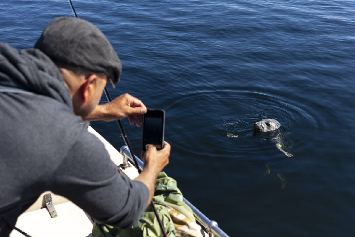 Unohtumaton kahvitauko Suomenlahden ylityksen jälkeen, Virossa, Vaindloon saaren edustalla. Utelias harmaahylje ilmestyi katsomaan, kuka oli saapunut sen vesille.