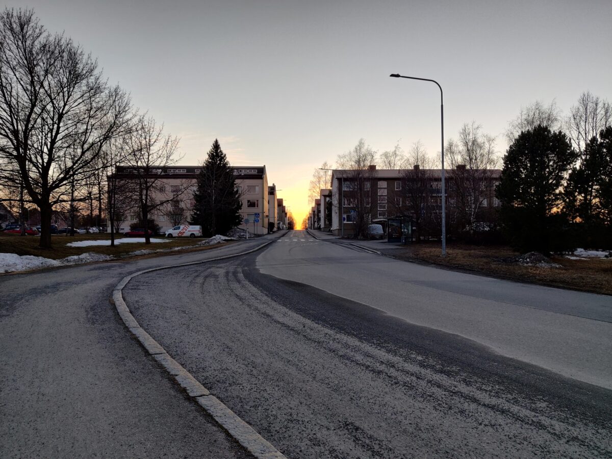Kaunis keväisen illan valo kuvattuna kaupungin laitamilla.