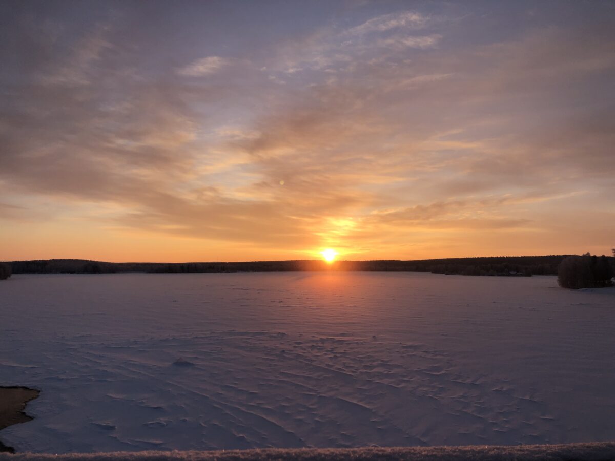 Itsenäisyyspäivän sarastus Kemijoella. Kuva napattu rautatiesillalta Rovaniemellä.