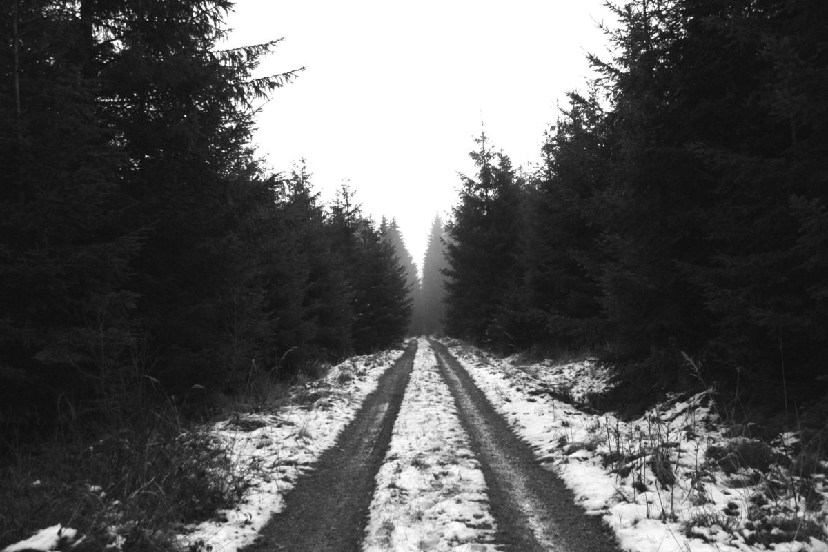Loppumaton metsäkonetie mustavalkoisessa kuvassa.