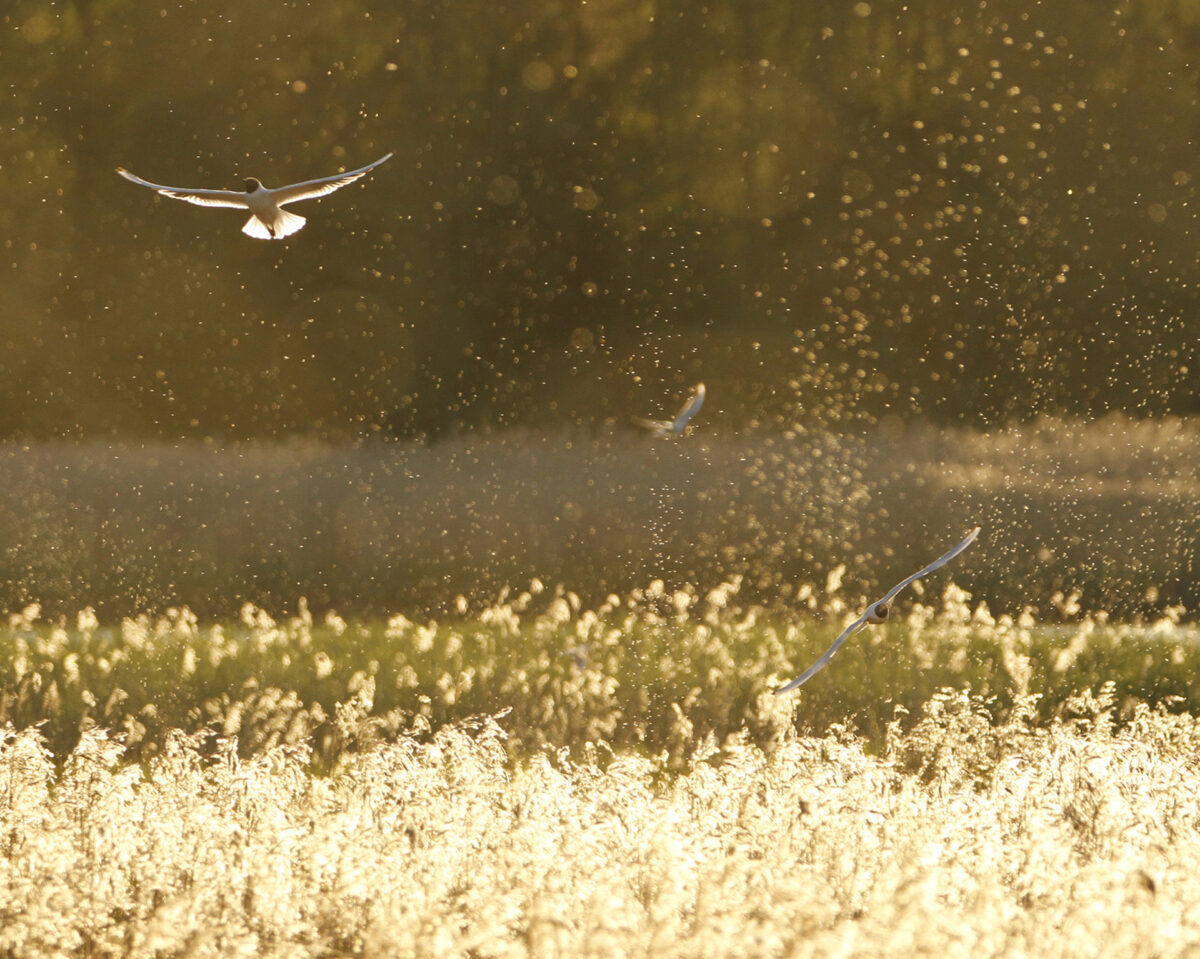 Naurulokit kaartelevat yhdessä höynteisten kanssa auringon laskiessa, kuin tanssien viimeistä valssia. Kuva otettu Morsfjärdenillä Kirkkonummella .