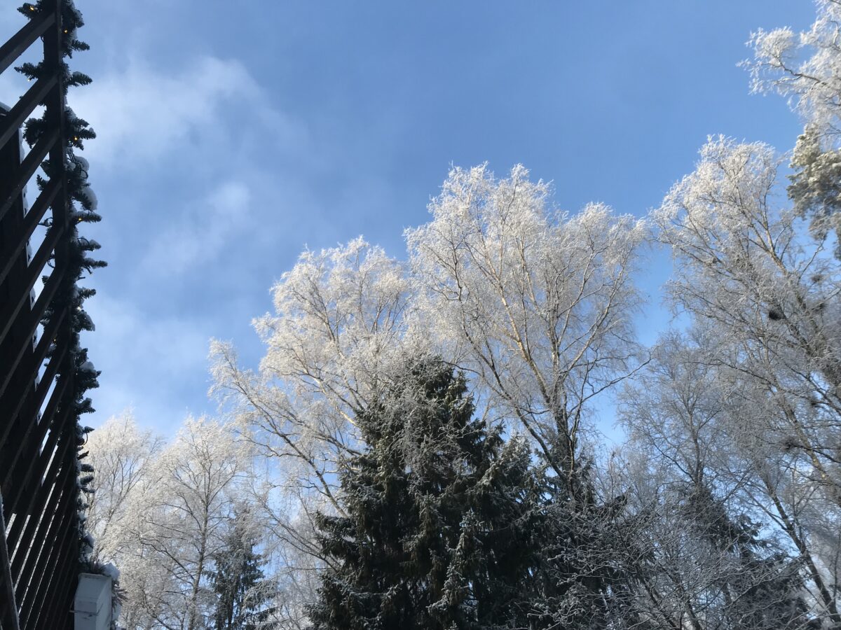 Jäiset puut luovat kuvan kauniin katon puutarhaamme