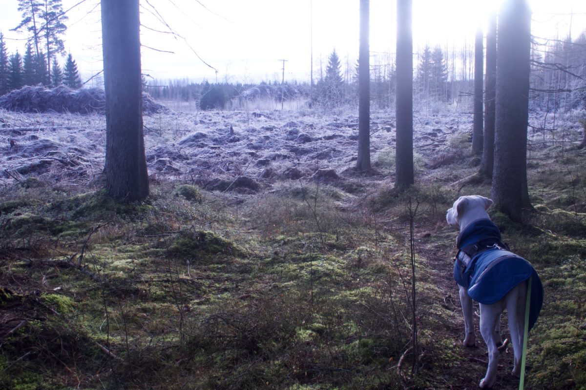 Ilmastonmuutos avohakkuualueella. Maisema kuin elokuvassa Game of Thrones jossa Valkoiset Kulkijat ovat tuhonneet kaiken tiellänsä olevan.